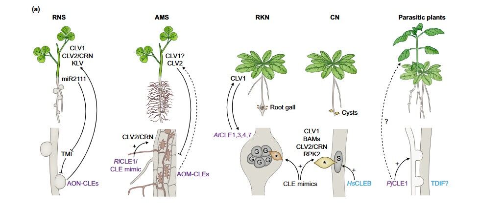 By reviewing recent findings on CLE functions, their receptors, and responses across different biotic interactions, we provide insights into the increasingly complex roles of CLEs in plant development and nutrient signaling.